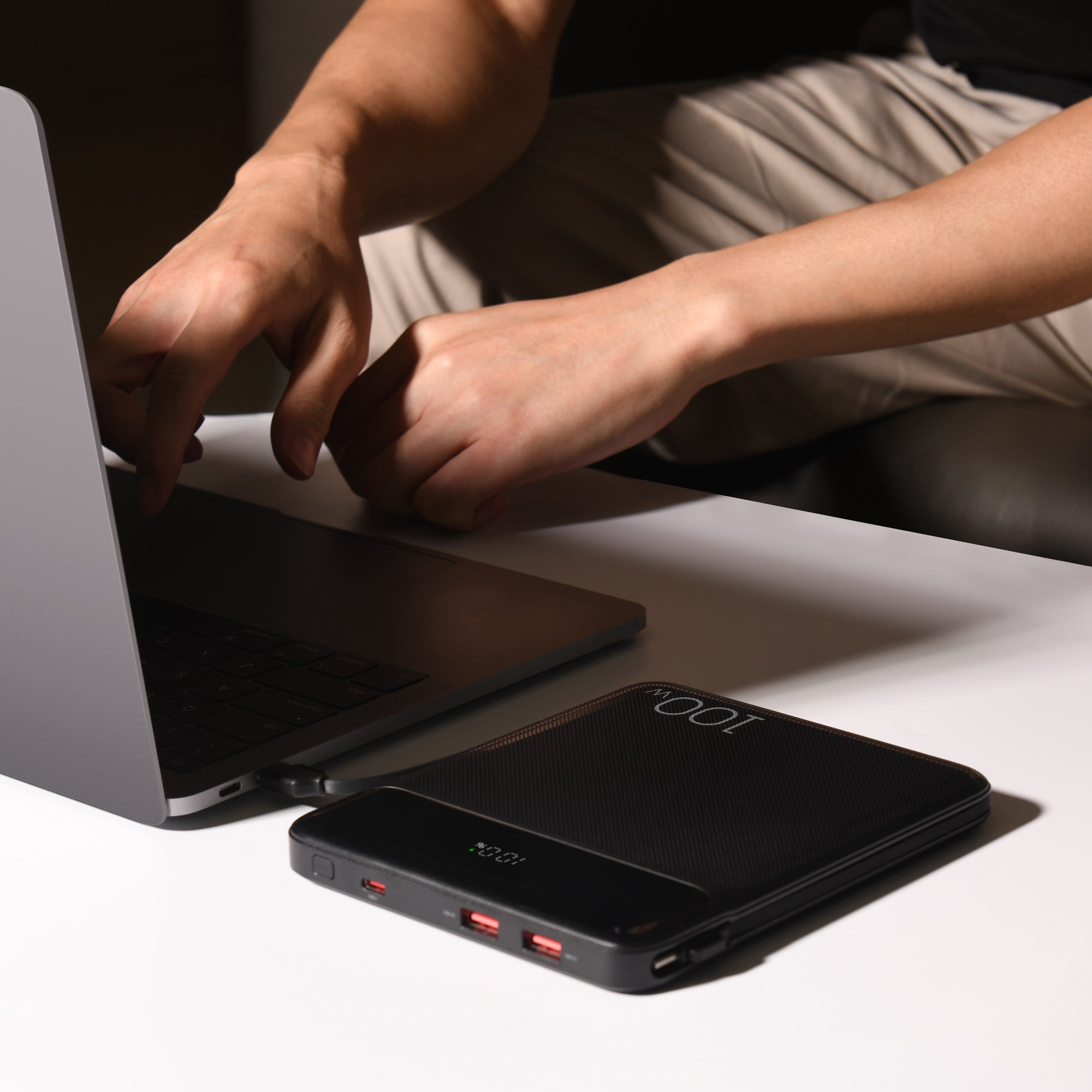 Stay powered on the go with our 100W Slim Power Bank. Designed for laptops, it features 2 USB-C Connectors, 1 USB-C port, and 2 USB-A ports for versatile charging. The sleek, portable design fits easily in laptop bags, while safety features protect against overheating. Charge fast and travel light!